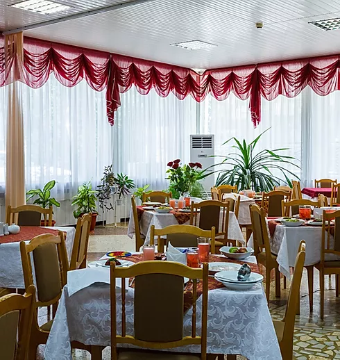 В санатории уютная обстановка, домашнее вкусное диетическое питание. Из свежих местных продуктов. Новая посуда. Вежливые официанты.