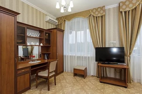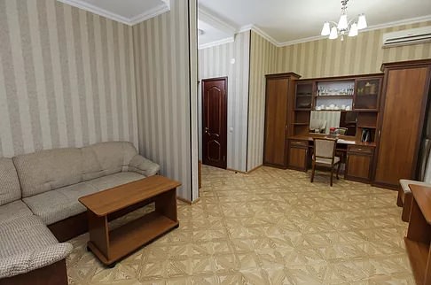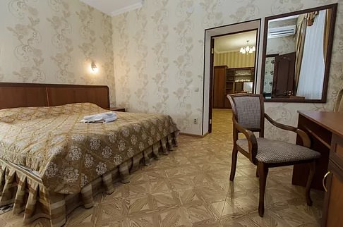 Высшая категория. Две комнаты - гостиная и спальня. Кровать 2-спальная размером 180х200, ЖК телевизор. Большой холодильник, мягкий угловой диван с креслами. Гладильная доска, утюг, набор посуды на 6 персон. В ванной: гидромассажная душевая кабина и ванна – джакузи, биде. Вид на Эльбрус.