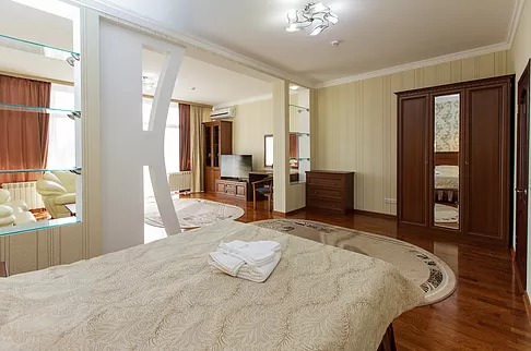 Высшая категория. 2 основных и 2 дополнительных места. Выделена спальная и гостевая зоны. 2- спальная кровать 220х200. Гладильная доска, утюг, ЖК телевизор ø84 см, кабельное ТВ 20 каналов. мягкий угловой диван, гладильная доска, утюг, набор посуды на 6 персон, душевая кабина, ванна. Вид на Эльбрус.